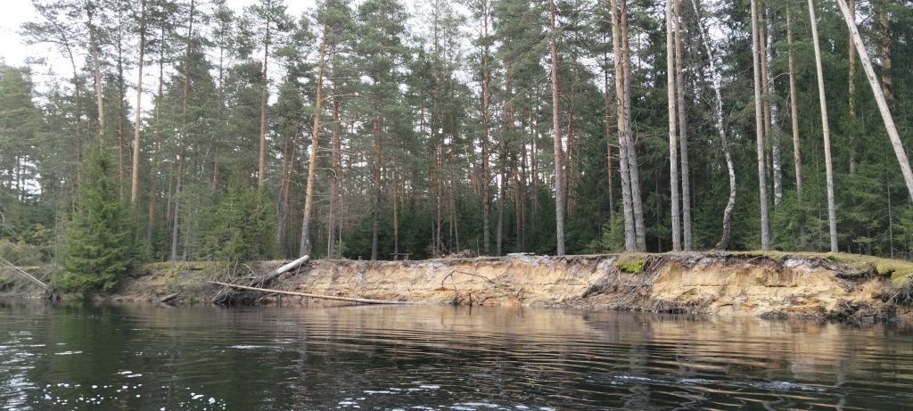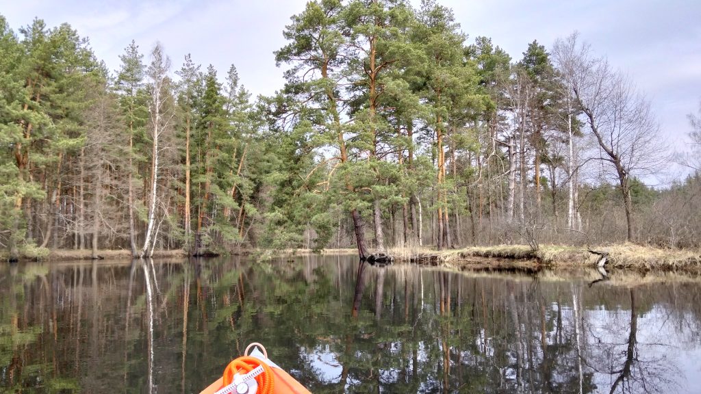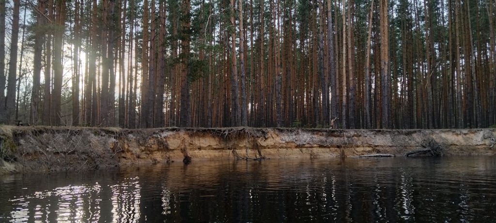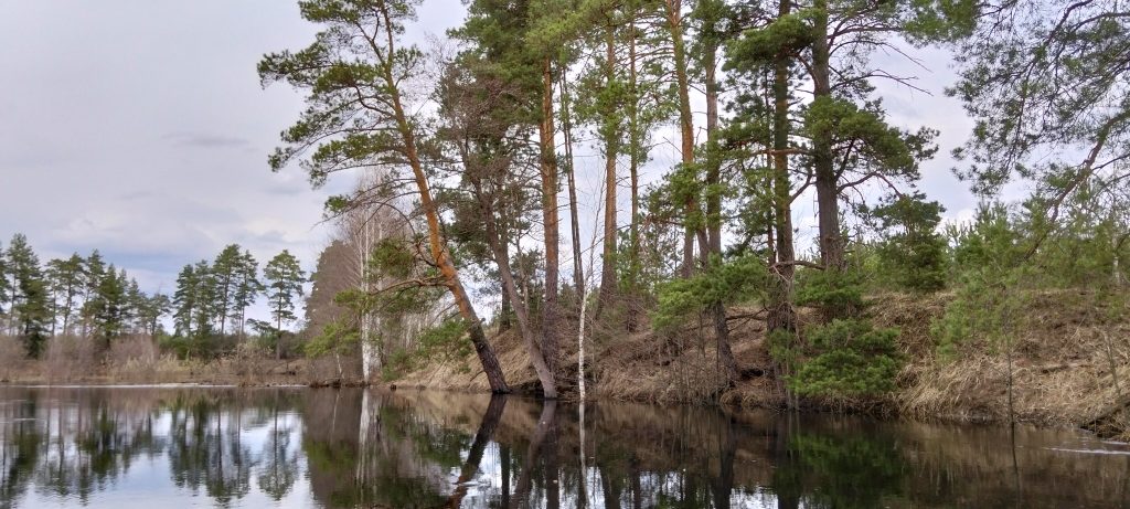 Сначала лесная часть радовала нас красивыми обрывистыми песчаными берегами, перемежающимися с затопленным лесом, в котором иногда невозможно было разглядеть, где заканчивается вода и заканчивается ли она вообще. Чем дальше мы забирались, тем более редкими становились высокие песчаные берега и стоянки. Карта показывала точки для стоянок, но, проходя от одной к другой, мы понимали, что все эти места затоплены или были затоплены совсем недавно и ещё очень сырые.