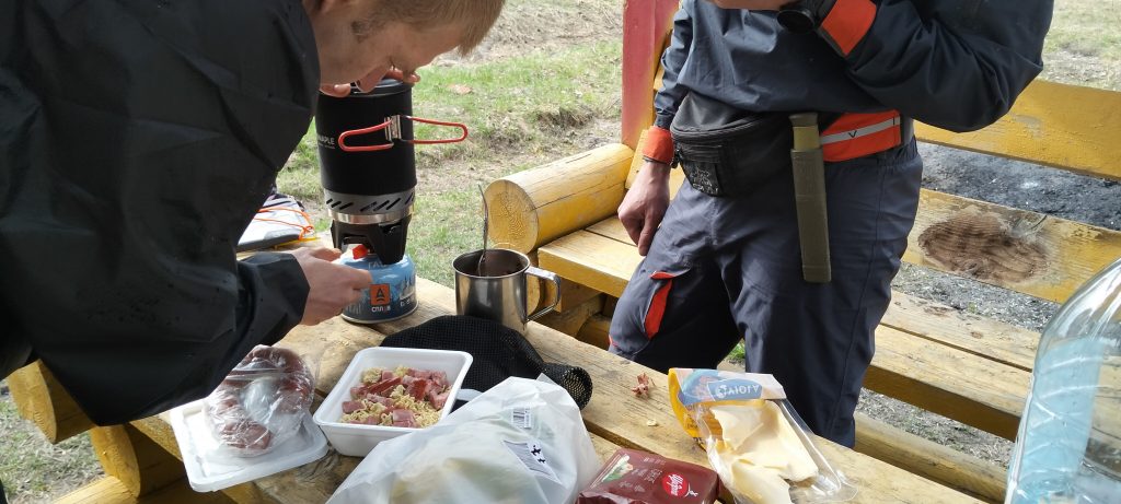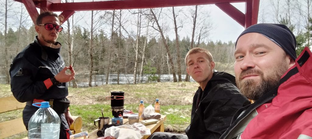 Заказанные незадолго до сплава перчатки на поверку оказались не неопреновыми, а какой-то комбинацией софтшелла и флиса. Насухую такие перчатки неплохо согревают, но к концу нашего семичасового перехода он уже неоднократно отжимал из них воду, руки мёрзли, как и ноги в неопреновых носках. Комфорта это не добавляло. Поэтому, как только мы добрались до места стоянки, то в первую очередь занялись отогреванием нашего неофита.