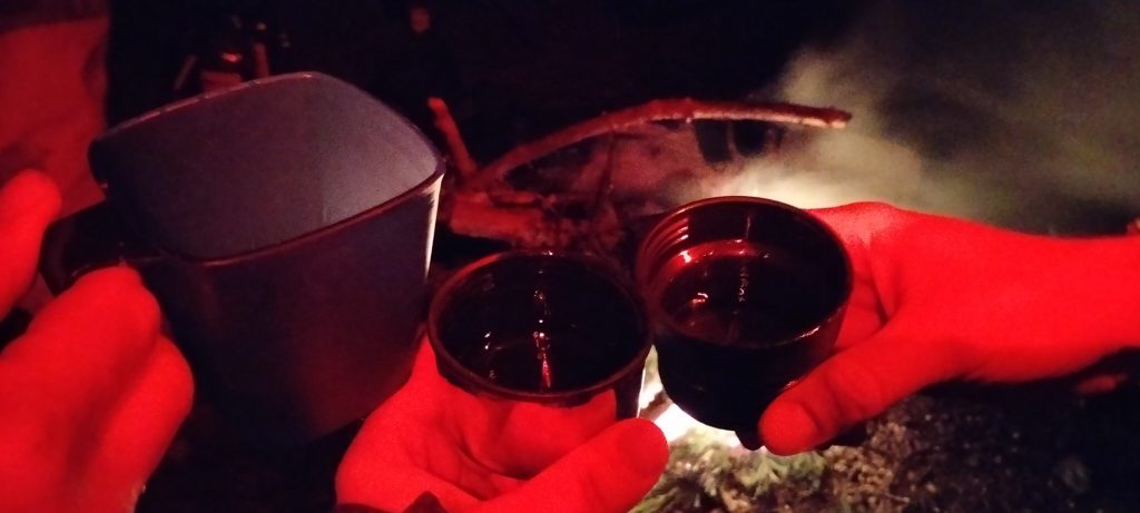 Скоро разведённый костёр, согревающий грузинский коньяк с выраженными нотами Ркацители: черносливом и грецким орехом, быстро сделали своё дело. Все переоделись в сухое и насладились медитативным вечером у костра. Проделанный путь и ранний подъём не оставили нам шансов на особенно долгие посиделки.