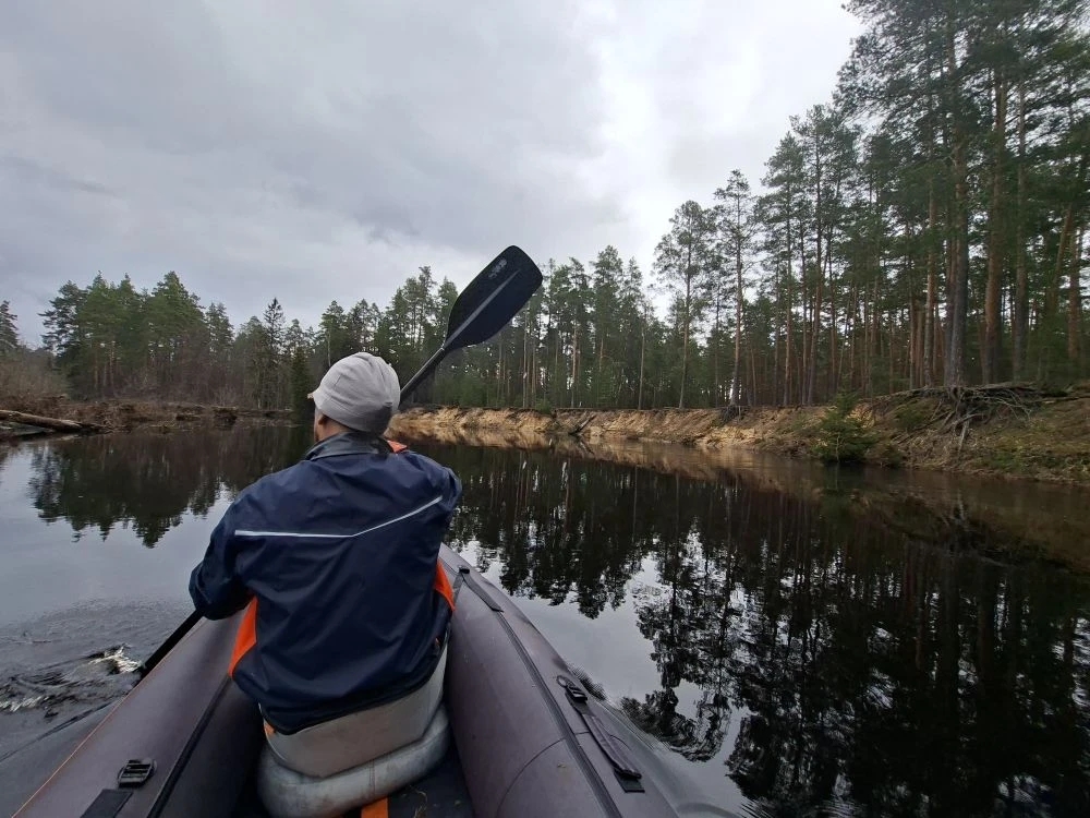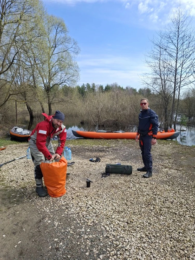 Для весенних сплавов у меня есть сухой костюм, который в апреле прощает любую погоду. Тёплое солнце и прохладный ветерок играли в пас моими сомнениями по поводу того, стоит ли надевать его сейчас. Решил надеть, но только по пояс, а сверху остаться в лонгсливе. Так, чтобы можно было быстро утеплиться, но не запариться на старте – формат хоть и небезопасный, но комфортный. Выбор был сделан удачно, и около 11 утра мы встали на воду и, преодолев прибрежные заросли, вышли в русло реки.