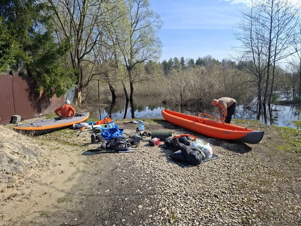 Здесь мы разместились для стапеля и начали разбирать лодки. Нам нужно было надуть их и переупаковывать вещи по гермам. На наши шумные сборы вышел один из жильцов, имя которого мы, к сожалению, не запомнили, он представился, кажется, Григоровичем, но я боюсь ошибиться. В беседе он немного рассказал нам о реке и местных особенностях, об активно приезжавших раньше туристах, количество которых, с его слов, в последние годы сошло на нет.
